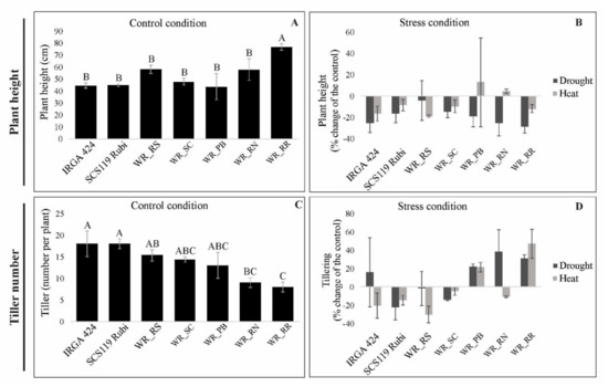 The panicle number is a yield component dependent on the tiller number. The highest tiller number was observed for the two rice cultivars: IRGA 424 and SCS119 Rubi (Figure 2C). On the other hand, the WR_RR genotype showed the lowest tiller number among all genotypes. The tiller number of IRGA 424 increased by 15% in drought and decreased 20% in heat stress, similar to WR_RN that showed increasing of 38% in drought and a reduction of 10% in heat stress (Figure 2D). The tiller number of SCS119 Rubi, WR_RS, and WR_SC declined in drought and heat stress conditions. The tiller numbers of WR_PB and WR_RR increased under both stress conditions.