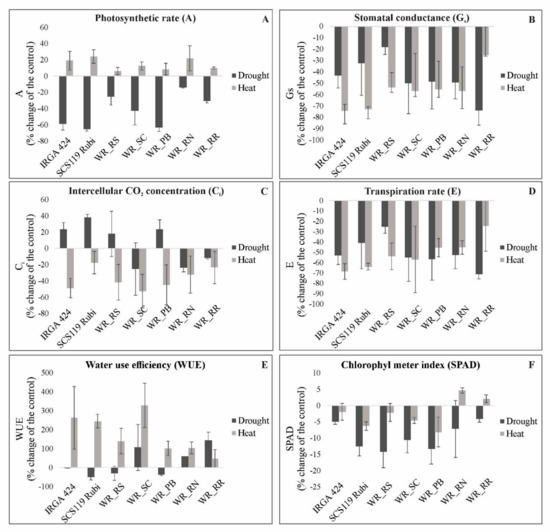 Drought stress reduced chlorophyll content in all genotypes (Figure 3F). Despite most genotypes showing reduced SPAD values under heat stress, WR_RN and WR_RR showed slightly increase SPAD values at 5 and 2%, respectively.