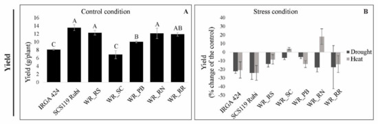 Under optimal conditions, SCS119 Rubi, WR_RS, WR_PB, WR_RN, and WR_RR yielded better than rice IRGA 424 (Figure 4A). However, WR_SC and WR_RN yield were not affected by heat, while all genotypes were affected by drought stress (Figure 4B). Interestingly, WR_RN was one of the genotypes showing the higher yield in the control condition and was the higher yielder in heat stress, showing good performance in a hot environment.