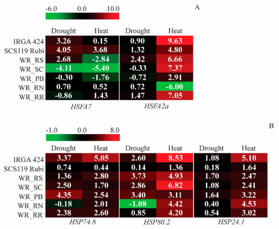 Considering the critical role of HSPs in stress signaling and mainly of HSP90 proteins, we analyzed the expression of two HSP90 genes, HSP74.8 and HSP80.2 [59]. In general, HSP74.8 showed transcript accumulation changes in heat and drought stress for most genotypes studied (Figure 5B). Specifically, HSP74.8 was upregulated in both stress conditions in all rice cultivars and weed rice genotypes (from 1.6 to 5.0 –fold), except WR_RN weedy rice, which was unaffected, under drought stress. HSP80.2 was also upregulated in all genotypes under heat stress (from 3.11– to 8.0 –fold) (Figure 5B). The expression of HSP80.2 was not affected by drought in SCS119 Rubi (1.3 –fold) and WR_RN (−1.01 –fold) and WR_RR (0.8 –fold).