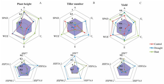 The expression of the TF HSF2a was positively correlated with yield under drought stress and strongly negatively correlated with yield under heat stress (Figure 6C). HSF2a did not change their expression in drought conditions, while yield was reduced compared to the control condition (Figure 4B and Figure 5A). Under heat stress, HSF2a was upregulated in almost all genotypes, and yield was reduced. The expression of HSP80.2 was negatively correlated with yield under heat stress and was upregulated in all genotypes.