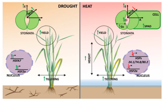 Proposed model of morphology, photosynthetic, and molecular responses for suitable performance in drought and heat stress conditions for rice and weedy rice plants. Red arrows mean decrease, and green arrows mean increase.