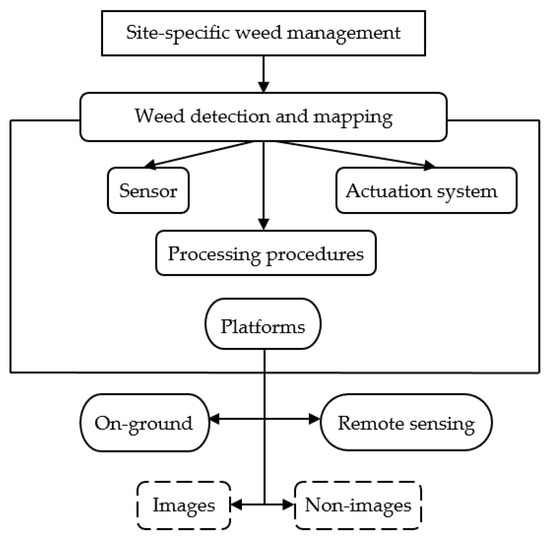 The first step in implementing a SSWM strategy is weed detection and mapping (Figure 1). This task includes creating a weed map by integrating the sensor, processing procedures, and the actuation system. On-the-ground or remote sensing technologies can be used to capture weed images or non-imaging data. Previous research has shown that ground-based approaches (also known as proximal sensing) can capture high-resolution images, allowing for the early detection of substantially lower weed densities, and the discrimination of primary plant species [16,17]. Alternatively, traditional remote sensing platforms such as piloted airborne and satellite may investigate wider areas but have lower image spatial resolution [18].