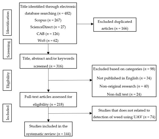 Full text of the original articles that meet those three categories was assessed in detail according to inclusion or exclusion criteria: weed detection using UAV, including RGB, multispectral imaging, hyperspectral imaging, and thermal imaging. Therefore, non-weed studies that irrelevant to UAV imaging were excluded. In the end, 144 articles were included in the systematic review, whereby their findings were then undergone data extraction and synthesis.