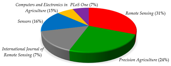 The publications were reported in journals and conferences were identified. The articles published in six high-ranking journals were the main source of information for this review. Figure 3 displays only articles that published more than two. Remote Sensing, Precision Agriculture, International Journal of Remote Sensing, Sensors, Computer and Electronics in Agriculture, and PLoS One were the top journals for weed detection using UAV.