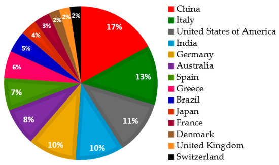 Geographical analysis showed that the scientific articles were mainly published by researchers from 14 countries: China, Italy, United States of America, India, Germany, Australia, Spain, Greece, Brazil, Japan, France, Denmark, United Kingdom, and Switzerland. (Figure 4).