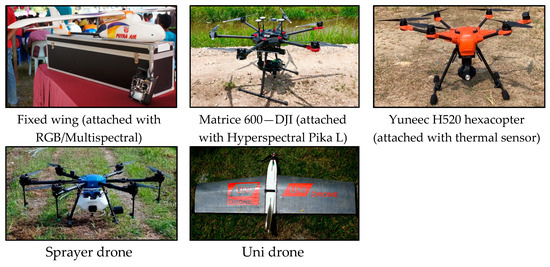 This review has figured out few types of UAV that being used for weed detection which includes single-rotor, multi-rotor, and fixed-wing (Figure 5). Ahmad et al. [40] used single-rotor as a spraying unit in the target and off-target zones for outer field weed control application. On the other hand, there are two studies that used the multi-rotor on the cultivated rice in China, in which Huang [38] captured imagery on few patches of Cyperus iric while Huang [52] captured the Chinensis, Cyperus iric, Digitaria sanguinalis, Scop, and Barnyard grass. In another study, Khan et al. [52] used multi-rotor to obtain imagery for two different crops which is pea and strawberry and Eleusine indica on infested weeds in Pakistan. In terms of fixed-wing, Zisi et al. [62] used this type of UAV to capture the images of S. marianum and patches of other weeds such as Solanum elaeagnifolium, Avena sterilis L., Bromus sterilis L., Cav, Cardaria draba L., Conium maculatum L., and Rumex sp. L. at the field that previously cultivated with cereals in Greece. Also, for fixed-wing that detect other weed types, Barrero and Perdomo [63] has detected Gramineae at the rice field in Columbia, whereas Tamouridou et al. [64] has identified S. marianum, and other weed types that consist the mixing of Avena sterilis, Rumexsp. L., Bromus sterilis L., Conium maculatum L., Cardaria draba L., and Solanum elaeagnifolium Cav at the field that previously cultivated with cereals in Greece.