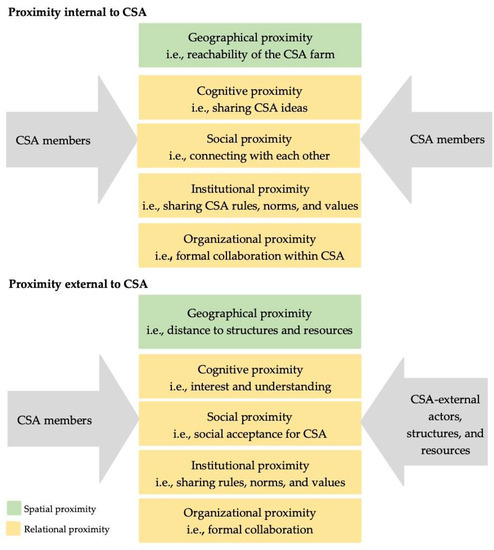 • Operationalization of geographical proximity: The spatial distance among CSA members (i.e., their access to the CSA farm) (CSA-internal) and the local availability of resources and structures for the CSA farm (e.g., farmland, urban area, infrastructure) (CSA-external) [16,21,48].