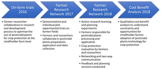 Decades of scientific research evidence support the effective protection of crops using pesticidal plants [3,8]. In comparison to synthetic pesticides, advantages of using pesticidal plants include their lower persistence in the environment, reduced impacts on non-target organisms including humans and reduced development of pest resistance [9]. Multiple benefits from pesticidal plants favour smallholder farming communities who can produce pesticidal sprays from local resources, often using multi-purpose plant species that may help pollinators and natural enemies [10,11], improve soil fertility [12,13] and act as foliar fertilisers [14] or green mulch [15,16], whilst avoiding associated costs from purchasing expensive synthetic products, and related issues such as adulterated or counterfeited products and application illiteracy [17]. Smallholder farmers involved in this study had used pesticidal plants for over three years. Since 2013, a research program has been undertaken to reinvigorate the use of pesticidal plants and involve farmers in the optimization of plant extraction and application through a farmer research network (FRN). Early studies focussed on efficacy [18,19], and these were followed by more participation by farmers and the development of a farmer research network (FRN) in 2016 (Figure 1). The FRN is a large-scale participatory approach that enables farmer research participation and empowerment [20]. Through the FRN approach, wider participation and perspectives need to inform adoption strategies. Hence, appropriate data on factors that can influence smallholder farmers’ uptake of pesticidal plants could inform efforts toward promoting the technology.