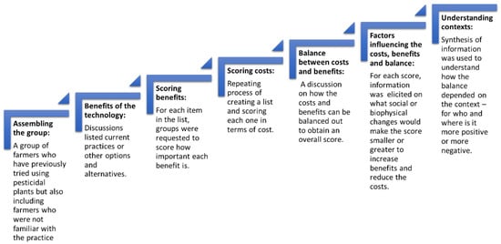 Focus groups discussions (FGD) were carried out with a total of 81 participants across 9 separate groups, which aimed at exploring costs, benefits, trade-offs and future investments for using pesticidal plants for pest management. Focus groups were based on pre-existing local groups of farmers who practiced pest management using pesticidal plants over the past two years, and participants in the FGD consisted of the same farmers involved in the individual questionnaire survey with the inclusion of four more farmers who could not participate in the questionnaire survey. Discussion focused on defining benefits and costs and then prioritising them. This was followed by discussing future options and contextual situations that could potentially influence costs and benefits of using pesticidal plants (Figure 2 and Supplementary Materials S2). The FGDs took place in January 2018, and group meetings took approximately two hours each, with audio recording to extract and codify information collected. All participants signed consent forms for involvement in the discussion.