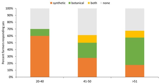 Relationship between the age of participants and their reported use of pesticidal plants and synthetic pesticides. Our results indicate that using synthetic pesticides decreased with increasing age. The opposite was observed for those using pesticidal plants extracts.