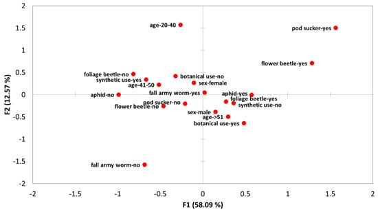 Multiple correspondence analysis where the first two dimensions (F1 and F2) can explain 70.6% of the variance observed among variables. The variables include the age and gender of participants, together with their responses on pest control options and pest species presence with respect to common bean crop production.