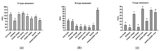 (a) The content of G-type monomer in 8 kinds of roughage; (b) the content of H-type monomer in 8 kinds of roughage; (c) the content of S-type monomer in 8 kinds of roughage. G means coniferyl alcohol; H means ρ-coumaryl alcohol; S means sinapyl alcohol. The different letters on the top means significant difference (p < 0.05); the same letters mean no significant difference (p > 0.05).