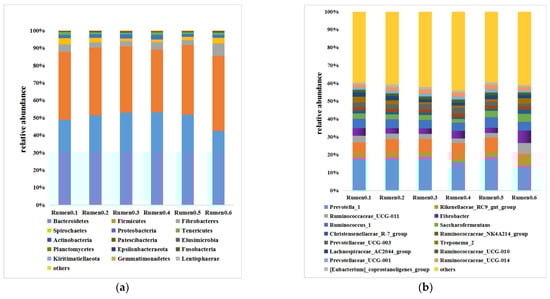 (a) Composition of rumen microorganisms at phylum level; (b) composition of rumen microorganisms at genus level. Notes: Rumen0.1, Rumen0.2, Rumen0.3, Rumen0.4, Rumen0.5 and Rumen0.6 represent the name of six rumen contents samples.