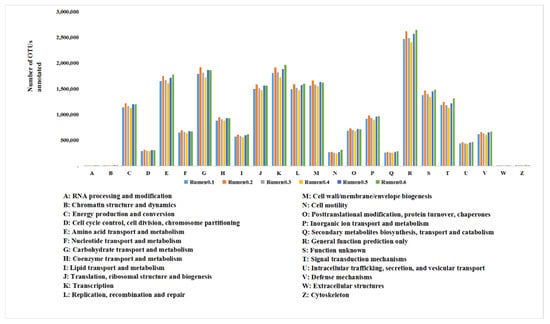 Prediction of Cluster of Orthologous Groups of proteins (COG) function of rumen flora. Notes: Rumen0.1, Rumen0.2, Rumen0.3, Rumen0.4, Rumen0.5 and Rumen0.6 represent the name of six rumen contents samples. Details about the samples are shown in Table A1 (Appendix A).