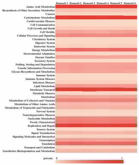 Prediction of rumen flora in the secondary pathway of Kyoto Encyclopedia of Genes and Genomes (KEGG). Notes: Rumen0.1, Rumen0.2, Rumen0.3, Rumen0.4, Rumen0.5 and Rumen0.6 represent the name of six rumen contents samples. Details about the samples are shown in Table A1 (Appendix A).