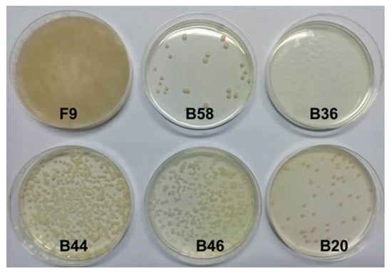 The collected rumen contents were repeatedly isolated and screened with a lignin screening medium. After purification and culture, one fungus and five bacterial strains were obtained. The results are shown in Figure 5 and named F9, B20, B36, B44, B46 and B58, respectively. The initial growth stage of fungus F9 is white filamentous, the edge is radial and the mycelium is long. With the increase in culture days, the mycelium color gradually turns gray, the mycelium circle also expands and dark spores grow. At first, strain B20 had a small colony, white and opaque texture, regular edges, smooth and moist, slow growth and light red color after 4–5 days of growth. Strain B36 is a thin white colony with a dry surface texture that is difficult to pick up. The strain B36 center is convex, and the shape is a concentric circle. Strains B44 and B46 were white dots and grew into sticky colonies with neat edges and yellowish color. Strain B58 grew from dots to regular circular colonies, with light yellow color, smooth, moist and sticky surface; neat edges; and gradually irregular edges after 4–5 days of growth.