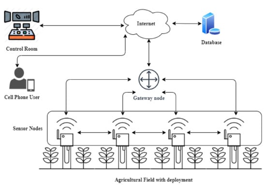 By the end of 2025, the world market in smart agriculture is predicted to reach USD 15.3 billion compared to USD 5 billion in 2016, which is more than triple of the market size in just about ten years []. Smart agriculture in the agri-product exporting countries will become a critical IoT field []. At present, smart agriculture has been applied in IoT applications such as irrigation sensors [], frost prediction of the event [], farming of precision soil [], identification of blind entity [], smart farming [], precision agriculture [], so on. Terrestrial wireless sensor networks (TWSN) and wireless underground sensor networks (WUSN) are the two types of WSNs being utilized in agricultural fields. Wireless underground sensor networks [] are planted inside the soil with higher frequencies being substantially reduced, while lower frequencies are allowed to permeate the soil [,,,]. The overview and the architecture of WSN in the agriculture environment is illustrated in Figure 2.
