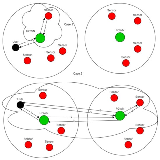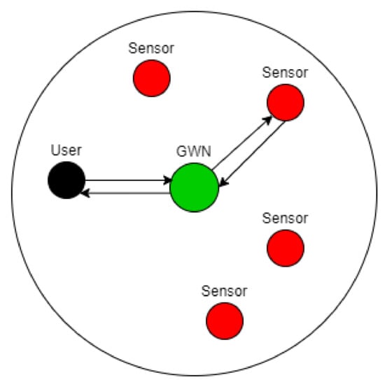 Amin and Biswas [], and H. Guo [] proposed a multi-gateway communication model, including users, gateway nodes (GWNs), and sensor nodes. Here, we divide gateway nodes into two categories: home gateway nodes (HGWN) and foreign gateway nodes (FGWN) according to the distance to other nodes—relatively close gateway nodes are called HGWNs, and the rest of them are called FGWNs. Sensors and gateway nodes are stationary after they are placed. The computing power of the gateway nodes is powerful, while sensors have low memory, low bandwidth, low battery power and limited computing power. Sensor nodes monitor and collect data, then send the sensed data to the nearest gateway node, i.e., HGWN. The HGWN forwards the received data to other FGWNs, users or sensors. For example, when a user wants to communicate with a sensor node, they need to authenticate each other.
