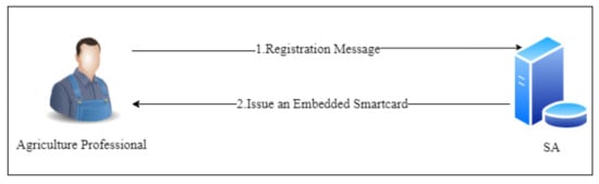 - Agriculture Professional chooses as an identity and , which is the password, and a random number R to computes and . Then, the parameters are securely transmitted to the SA as a registration request.