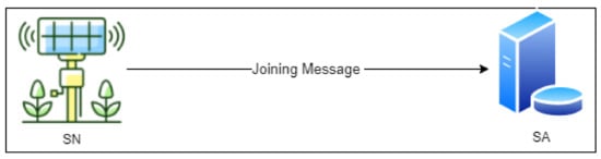 - Firstly, the sensor chooses an identity , and a random number is generated for each sensor to compute , and . Then, the sensor sends to the SA securely.