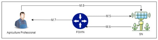 - The FGWN receives , it checks the freshness of the timestamp , and computes and . Then, it validates if holds, the FGWN calculates , and Finally, FGWN prepares and sends the to the .