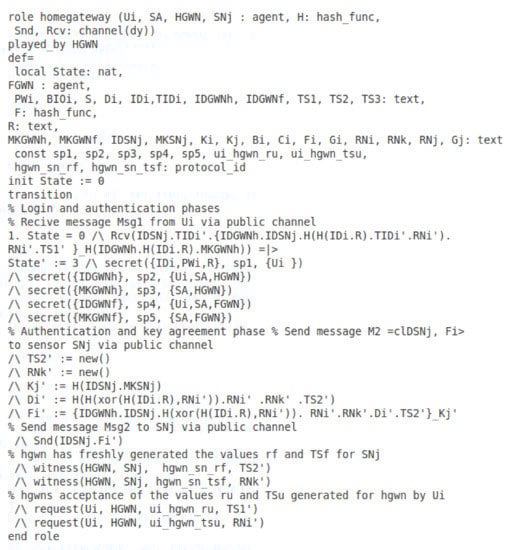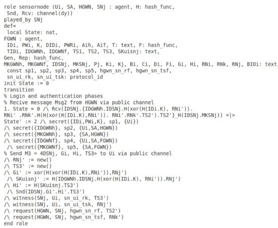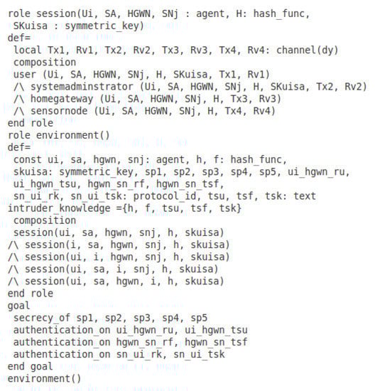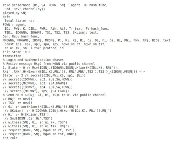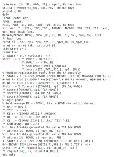 This section applies the Burrows–Abadi–Needham logic (BAN) to the proposed scheme to conduct a formal analysis. The BAN logic [,] is used widely to ensure the security of the key agreement-based authentication protocol [,,]. First, communication parties establish the protocol’s accuracy: the user Ui and the sensor node Sn, which exchange a freshly formed session key after the execution of the protocol. We begin by illustrating the BAN logic with the following specific notations: