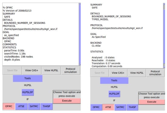 - Mutual authentication: The proposed scheme provides mutual authentication because the agriculture professional sends the login message, say to the HGWN via a public channel. Upon receiving message, the HGWN verifies the by selecting a new timestamp to check the freshness where is allowed transmission delay. Furthermore, it decrypts where depicts the decryption of a symmetric key using the key . After retrieving the information, HGWN verifies the timestamp where is the message receiving time. If it holds, it checks and and if these parameters are valid, it computes based on the stored , and , then checks . If it does not hold, it terminates the session. The verification will fail here since the validation depends on the one-way hash function. Therefore, mutual authentication is provided in the proposed scheme among all the participants.