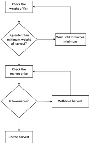 The harvester agent undertakes the activities starting from smolt deployment up to harvesting. The harvesting decisions are made considering the market situation and optimal weight of the fish product to maximize the return on feed. To capture the trade-off between these two considerations, an additional holding cost of fish, known as carrying cost, for delaying the harvest is included, which is primarily the additional feeding cost of the fish after it reaches harvesting weight. To simply the model, the weight of the fish is divided into two categories. The first category represents the weight of the fish which is regarded as not suitable for harvesting and the second represents the weight of the fish above this minimum threshold. In practice, fish are never harvested and slaughtered before reaching 1 kg. Figure 3 illustrates this decision-making sequence of a harvester agent.