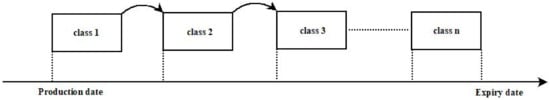 The shelf-life of fresh HOG salmon is quite short and therefore is sold directly to market soon after harvesting and slaughtering. However, valued added processed products can be stocked for a certain time, thereby providing a buffer against stochastic variation in demand. Moreover, due to the lower degradation rate and lower price volatility of these products, the producer has more flexibility in the timing of sales to customers. As such, the perishable and durable products require different inventory control policies. In the case of perishable fresh products, it is usually decided where it will be sold at the beginning of the production process. However, value added processed products which are produced to stock will have a longer, but specific shelf-life. Therefore, it is also critical to manage how long these products remain in stock. For modelling purposes, we classify the available stock into various classes depending on the shelf-life of the product with respect to production date and expiry date. As the simulation time progresses, the inventory from a particular class is moved to the next class as shown in Figure 4. By so doing, the inventory manger will send products within the expiry date from available stock depending on the customer’s expected waiting time for the product.