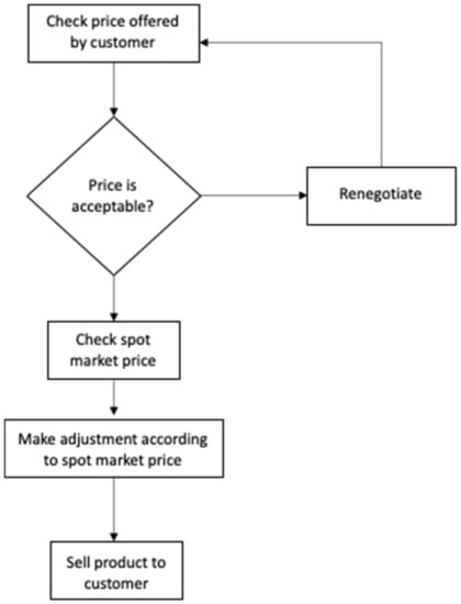 In this seafood sector, a customer approaches the producer with an offer to purchase, so the sales contract is modelled with the customer taking the first step in the contract negotiation (Figure 5). It is assumed that if the contract is realized, the full amount of fish specified in the contract must be delivered within the specified time period. The model assumes a fixed price contract is in place. In this type of contract, the initial price mentioned in the contract will remain the same through the contract period, however, once the spot price is realized, the final price can be adjusted according to a difference between the spot price and the contract price (Figure 5).