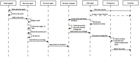 The protocol diagram depicts high-level agent interactions, decisions and tasks associated with each agent. The protocol diagram or sequence diagram is an interaction diagram that explains how and in what sequence a group of objects or agents work together. In Figure 6, the interactions and individual actions from top to the bottom can be considered the actions sequence for the simulation run. The model developers use the protocol diagram to document and communicate agents’ actions and interactions. It also helps to model the logic of complex agent interactions and operations. The agents’ interactions primarily take place through the message flow between agents and the protocol diagram describes the message flow between agents. These messages include explicit information such as customer demand and implicit knowledge related to a particular agent’s decision-making, for example, harvesting decisions.