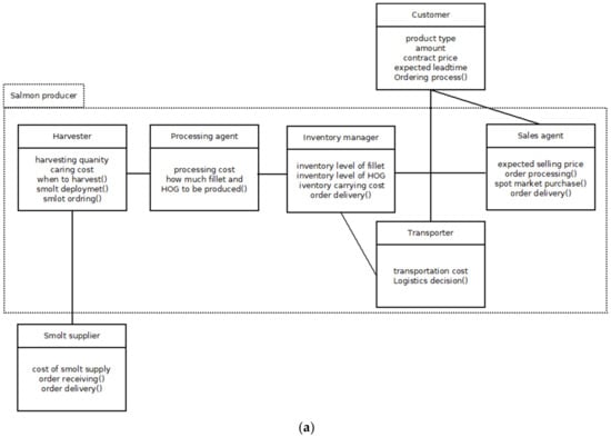 As outlined in the previous section, the agents are implemented through the objects of a class where class represents agents’ characteristics and actions. The UML (Unified Modelling Language) class diagram is a visual representation to construct and visualize object-oriented systems. In that sense, the high-level class diagram (Figure 7a) a is a depiction of all agent classes in the modelling system. This diagram provides a high-level view of agents or the associated functions and interactions of the agents before the implementation in an object-oriented framework. The class diagram is a structured diagram that demonstrates the interrelationship of the system (in the present study the agent-based simulation model) by illustrating the classes, their parameters and functions and interrelationships among other objects or agents. For example, the features of customer demand and action of the customer which is the ordering can be easily identified from the customer class in the diagram. Moreover, which are the agents that the customer is going to interact with, such as the sales agent for placing the order and the transporter agent for receiving the ordered item, can be seen from the diagram.