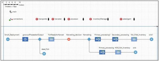 Discrete-event simulation is widely used for capturing a system as a process, i.e., a series of actions being done by entities such as products, parts or customers. These processes normally consist of delays, resource utilization and waiting in queues. The salmon supply chain model adopts a discrete-event approach to represent production and processing activities in the chain (Figure 8). Once the smolt is received from the supplier it is deployed, which is modelled using a “source block”. The source block creates entities or agents as a starting point in the process model. In our model, the processing starts with smolt deployment. The grow-out phase occurring in the sea is modelled using a “delay block”. A delay block usually delays the entities passing through the block for a specific amount of time. Following that, a “select output block” is used to model the portion of fish lost loss due to death, with these dead fish exiting the system captured by a “sink block”. Once the grow-out phase is completed, the fish are ready for harvesting. This is represented by a “queue block” which acts as a buffer entity, where the fish are waiting for the next process in the system. The next process in salmon production is the harvesting decision and this is modelled using a “hold block”. Using the hold block we can temporarily stop the entities moving to the next modelling block. The specific parameters of this hold block are captured with Java code. This way we can accurately model the harvesting decision being dependent on external factors such as market conditions. Having made the harvesting decision, the harvested fish are routed using a “select output block” for either fillet (value add process) or HOG fish production. The primary and secondary processing steps are captured adopting a “service block” that seizes a given number of entities, delays these seized units, and then releases the seized units once the required processing time is elapsed. Once the processing activities are finished, they products are held in inventory, which is again modelled using the queue block.