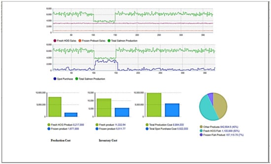The model is implemented using the case of the largest salmon producer in Norway. The company manages activities across the supply chain, including feed production, farming, processing, distribution, sales and marketing. The company believes that this vertical integration strategy enables it to control costs, improve product quality and improve efficiency. The case study focuses on the company’s Norwegian operations. We use data from [] and from company reports, which are outlined in Table 1 and Table 2. Table 1 presents the production cost calculation which is adopted from the study by [], while inventory cost, processing cost, logistics costs and spot purchase cost are outlined in Table 2. The steady-state baseline behaviour of the salmon supply chain is then illustrated in Figure 9.