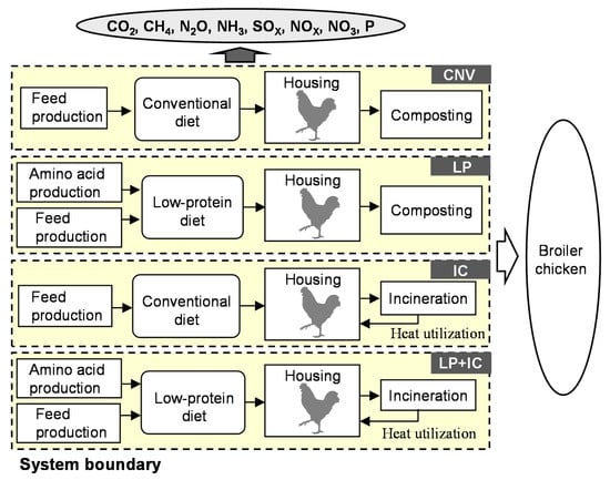However, the use of a low-protein diet with CAAs involves additional environmental emissions derived from the manufacturing of CAAs, and this affects the emissions from feed production and those from manure management because of changes in the diet and manure compositions. The introduction of litter incineration also affects the emissions from manure management due to the changes in the emission factors of environmental pollutants. The effects of a low-protein diet with CAAs and litter incineration on the life cycle environmental impacts of broiler production have not yet been investigated.