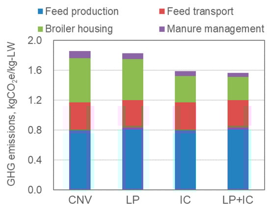The GHG emissions from the four broiler production systems in Japan are illustrated in Figure 2. The GHG emissions from the CNV, LP, IC, and LP + IC systems were 1.86, 1.83, 1.59, and 1.57 kg CO2e/kg LW, respectively. The IC and LP + IC systems had 14% and 16% lower GHG emissions than the CNV system, respectively, and the reduction of CO2 emissions derived from fossil fuels in the broiler housing process contributed to the lower GHG emissions in these two systems. The feed production process was the largest GHG source (43%) followed by the housing process (32%) for CNV. For LP and LP + IC, the feed production process was also the largest GHG source; however, the feed transport was the second largest due to relatively lower GHG emissions from broiler housing. Carbon dioxide was the largest source of GHG emissions in all four systems.