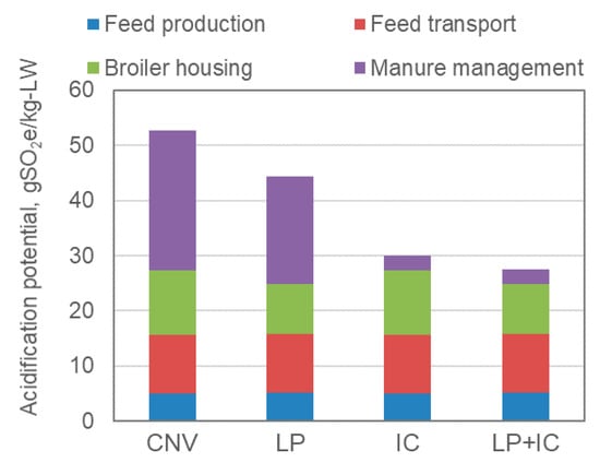 Figure 3 depicts the acidification potential of the four broiler production systems. The acidification potentials of CNV, LP, IC, and LP + IC were 52.6, 44.3, 30.3, and 27.6 g SO2e/kg LW, respectively. The LP system showed a 14% lower acidification potential than the CNV system due to lower NH3 emissions from the broiler housing and manure management processes. The IC and LP + IC systems exhibited further lower acidification potentials than the CNV system, by 43% and 48%, respectively, due to much lower NH3 emissions from the manure management process. The NH3 emissions from manure management were the largest sources of acidification for CNV and LP, whereas the NH3 emission from broiler housing was the largest source for IC and the acidifying pollutant emissions from feed transport were the largest source for LP + IC.