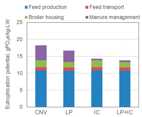 The eutrophication potentials of CNV, LP, IC, and LP + IC were 18.3, 16.7, 14.3, and 13.8 g PO4e/kg LW, respectively (Figure 4). The lower NH3 emission from broiler housing and manure management contributed to lower eutrophication potentials for LP and LP + IC compared to CNV. The feed production process was the largest source of eutrophication for all four systems.