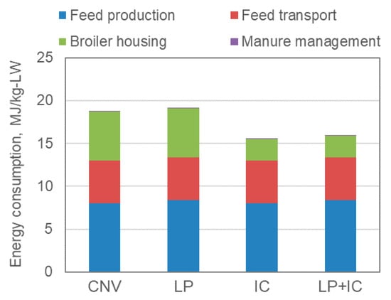 Figure 5 explains the energy consumption of the four broiler production systems. The energy consumption of CNV, LP, IC, and LP + IC was 18.8, 19.1, 15.6, and 15.9 MJ/kg LW, respectively. The IC and LP + IC systems had lower energy consumption than the CNV system due to the use of less fossil fuel in the broiler housing process; however, the LP system had slightly higher energy consumption due to higher energy use in the feed production process.