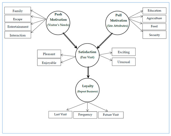 Although the role of motivation in determining visitors’ satisfaction and loyalty to most leisure activities is widely recognized in the literature [24,25,27], its application to agricultural event participation such as agricultural fairs is scarce. Even if the role of motivation is recognized, most studies focus on identifying the primary causes for participating in the event rather than evaluating its impact on visitor satisfaction and destination loyalty [28,29,30]. For instance, Hixson et al. (2011) assess the reasons for participating in special events and find that place attachment motivates young Australians to participate in recreational activities, including agricultural fairs. Similarly, Phithakitnukoon (2020) reports that visitors’ desire to spend time with the family, escape from daily routines, and gain knowledge about agriculture motivate producers to participate in agricultural fairs in Thailand. This study attempts to fill this gap in the literature by (i) identifying critical factors that motivate people to attend agricultural fairs and (ii) evaluating whether these factors also determine visitors’ satisfaction and (iii) enhance consumer loyalty [31,32].