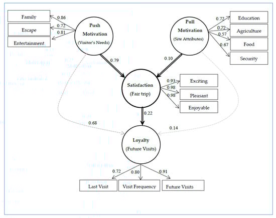 On the other hand, fair visitors’ loyalty was positively affected by all three other latent constructs. The direct effects of pull motivation, push motivation, and satisfaction on visitor loyalty were 0.12, 0.42, and 0.26, respectively. The pull (0.02) and push (0.20) motivations also influenced customer loyalty indirectly through their impact on visitor satisfaction (the indirect effects are not reported in Table 5). These results showed that the total effects of push motivations on visitor satisfaction and loyalty were much higher (0.77 and 0.62) than pull motivations (0.08 and 0.14). Moreover, trip satisfaction significantly impacted consumer loyalty, implying that satisfied customers are more likely to revisit the fair soon. These results are much stronger than reported in previous studies on tourism motivation [23,24,32,36,69].