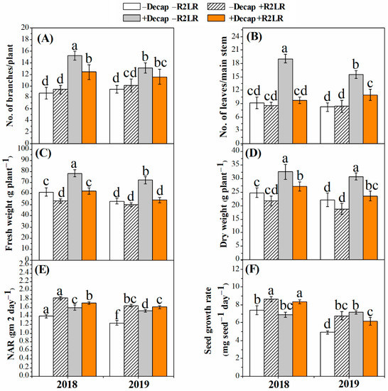 Effect of decapitation and raceme removal treatments on the number of branches (A), number of leaves (B), fresh weight (FW, C), dry weight (DW, D), net assimilation rate (NAR, E), and seed growth rate (SGR, F) of soybean plants. −R2LR and +R2LR: no removal and removal of the two lowest racemes, respectively; −Decap and +Decap: no decapitation and decapitation, respectively. Different letters above the bars indicate significant differences between the treatments, according to Duncan’s multiple range test at P ≤ 0.05. Bars represent the means ± SD (n = 4).