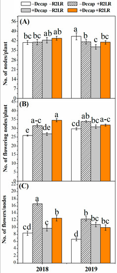 Effect of decapitation and raceme removal treatments on the number of nodes (A), number of flowering nodes (B) and number of flowers/node (C) of soybean plants. −R2LR and +R2LR: no removal and removal of the two lowest racemes, respectively; −Decap and +Decap: no decapitation and decapitation, respectively. Different letters above the bars indicate significant differences between the treatments, according to Duncan’s multiple range test at P ≤ 0.05. Bars represent the means ± SD (n = 4).
