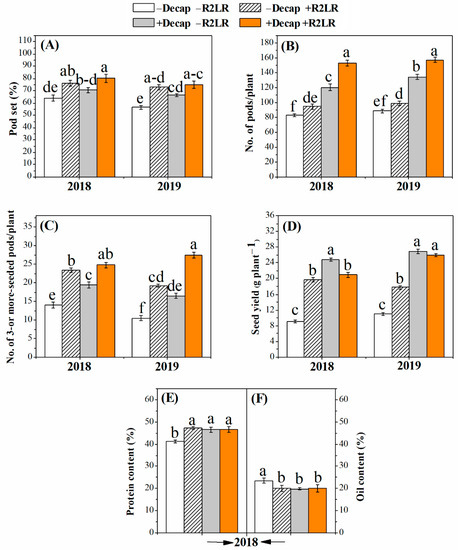 Effect of decapitation and raceme removal treatments on pod set(%, A) number of pods per plant (B), number of 3- or more-seeded pods per plant (C) seed yield per plant (D), protein content (%, E) and oil content (%, F) of soybean plants. −R2LR and +R2LR: no removal and removal of the two lowest racemes, respectively; −Decap and +Decap: no decapitation and decapitation, respectively. Different letters above the bars indicate significant differences between the treatments, according to Duncan’s multiple range test at P ≤ 0.05. Bars represent the means ± SD (n = 4).