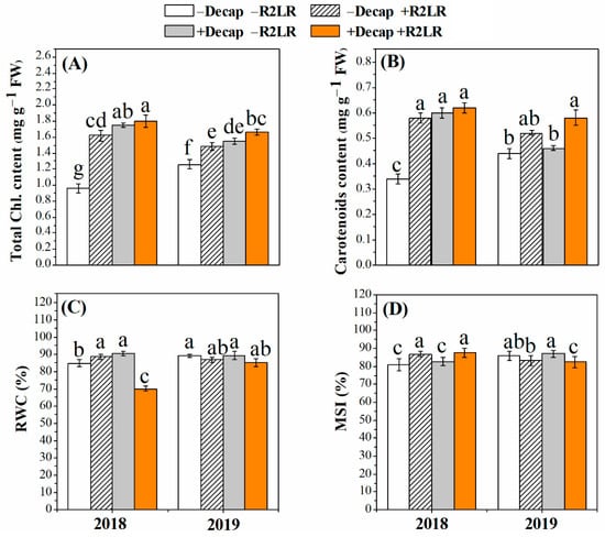 Effect of decapitation and raceme removal treatments on chlorophylls content (A), carotenoids content (B), Relative water content (RWC, C), and membrane stability index (MSI, D) of soybean plants. −R2LR and +R2LR: no removal and removal of the two lowest racemes, respectively; −Decap and +Decap: no decapitation and decapitation, respectively. Different letters above the bars indicate significant differences between the treatments, according to Duncan’s multiple range test at P ≤ 0.05. Bars represent the means ± SD (n = 4).