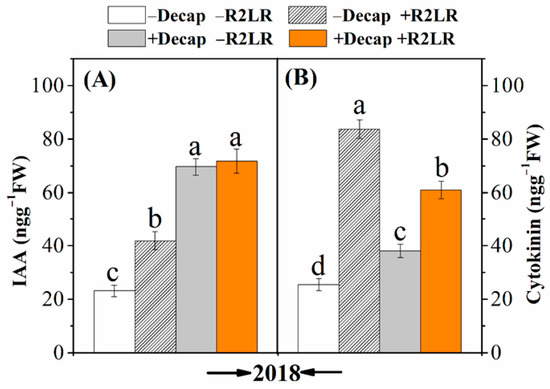 Effect of decapitation and raceme removal treatments on IAA (auxins) (A) and cytokinins (B) contents of soybean leaves. −R2LR and +R2LR: no removal and removal of the two lowest racemes, respectively; −decap and +decap: no decapitation and decapitation, respectively. Different letters above the bars indicate significant differences between the treatments, according to Duncan’s multiple range test at P ≤ 0.05. Bars represent the means ± SD (n = 4).