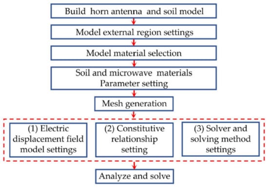 In the process of simulating the electric field law of the water-bearing soil under different microwave output powers, the soil and horn antenna are modeled first, the properties of the external area of the model are set, and the model materials are set. Then, the model parameters are set and meshed, and then the electric displacement field model, constitutive relationship, solver and solution method, and finally analyze and solve are set. In this process, the relevant parameters need to be set according to the test requirements so that the simulation process is as consistent as possible with the actual situation. The main steps of the simulation are shown in Figure 1.