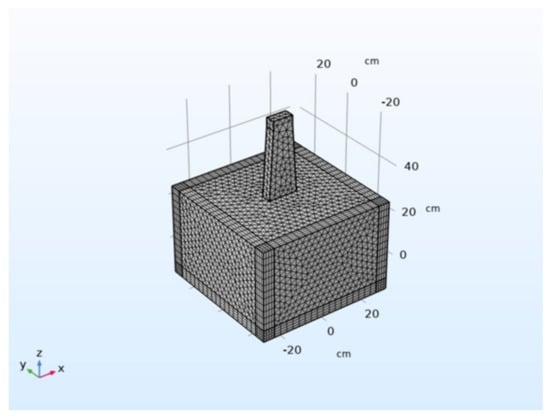 Table 1 and Table 2 provide the main parameter settings in the simulation process. Table 2 lists the real and imaginary parts of the dielectric loss of different water-containing soils at a frequency of 2.45 GHz, which are also important parameters determining the accuracy of the simulation results [18]. The ideal meshing approach should provide a high resolution to achieve the required accuracy and should exhibit a high quality and low computational cost, but these requirements often conflict. Regarding simple models, automatic meshing with software is generally implemented. In addition, different physics schemes and solvers have distinct requirements for mesh quality. In this simulation, full coupling in the steady-state solver is selected to linearly solve the simulation problem. A small number of mesh elements with a quality lower than 0.01 among noncritical parts does not affect the convergence process of the entire model. Figure 2 shows the grid division of the horn antenna-soil model.