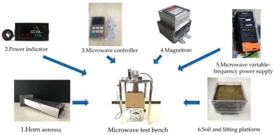 The experimental bench for microwave soil treatment mainly comprises a horn antenna (300 × 125 × 45 mm, MEGMEET Electric Co., Ltd., Shenzhen, China), power indicator (D69-2049, Elecall Electric Co., Ltd., Shenzhen, China), microwave controller (WepeX-C1, MEGMEET Electric Co., Ltd., Shenzhen, China), magnetron (2M362, LG, Seoul, Korea), microwave variable-frequency power supply (WepeX-C1, MEGMEET Electric Co., Ltd., Shenzhen, China), and lifting platform (300 × 300 mm, Weihai Jidao Hardware Tools Co., Ltd., Weihai, China). As shown in Figure 3, in the experiment, the microwave output power is adjusted with the microwave controller. The value displayed on the power indicator represents the output power of the microwave variable-frequency power supply, and the value displayed on the controller panel represents the actual microwave output power. The actual microwave output power is 0.6 times the rated power.